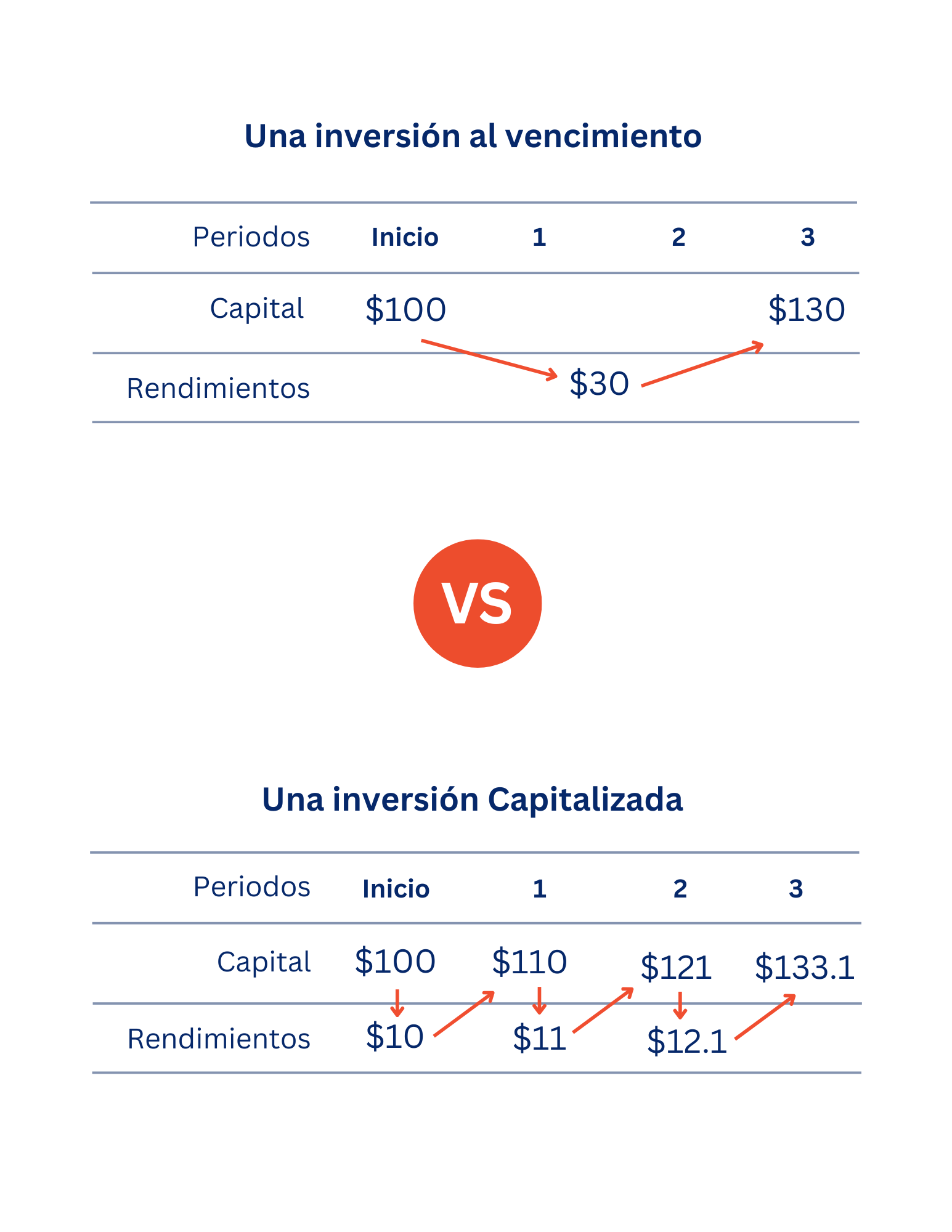 Empiezas con un monto, digamos $100. Esto se llama el capital inicial. Te pagan un porcentaje sobre ese dinero, digamos 10%. Ahora tienes $110.